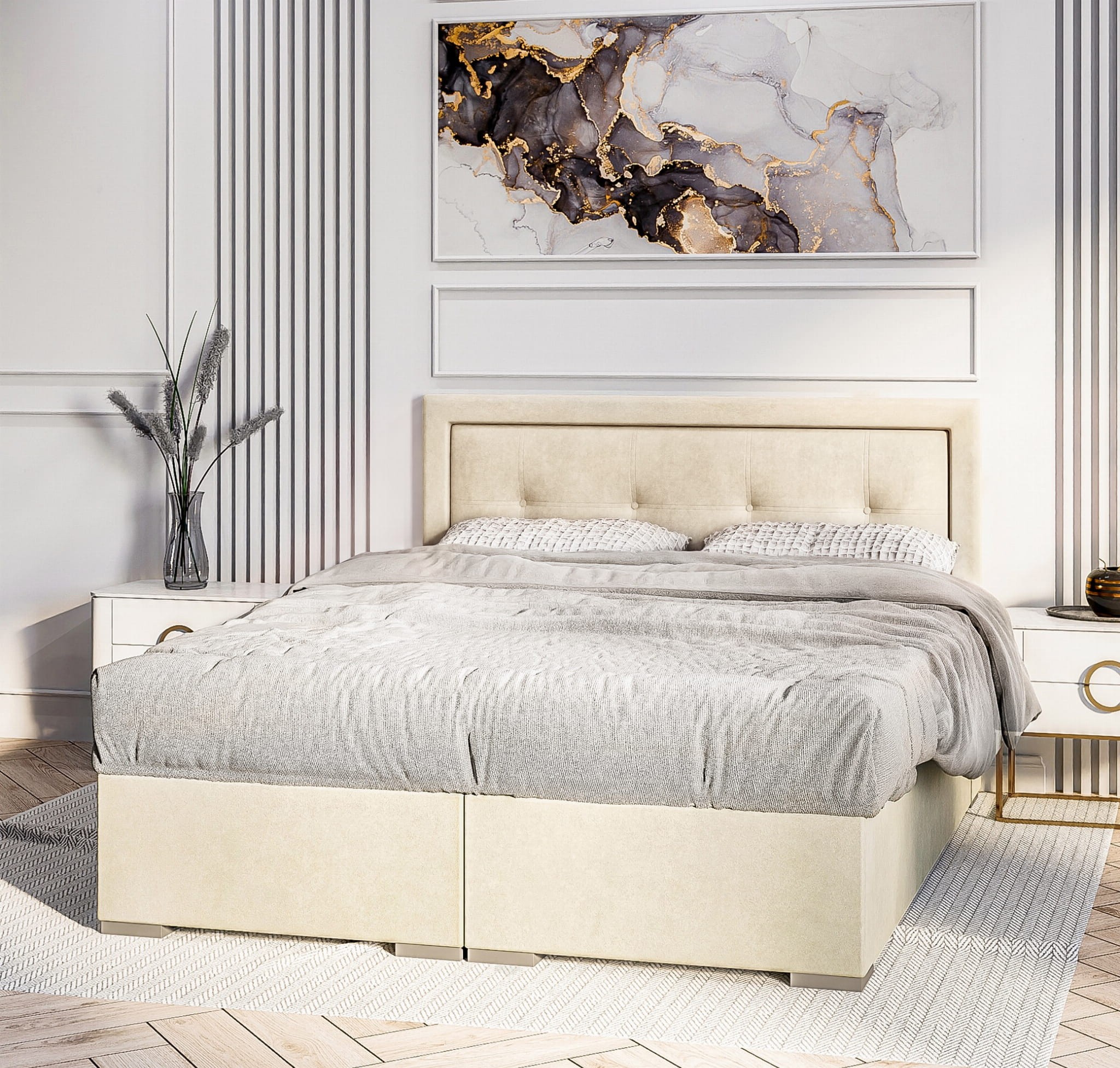 Łóżko kontynentalne SELIA - klasyczne łóżko kontynentalne z pikowanym wezgłowiem i guzikami oraz pojemnikiem na pościel