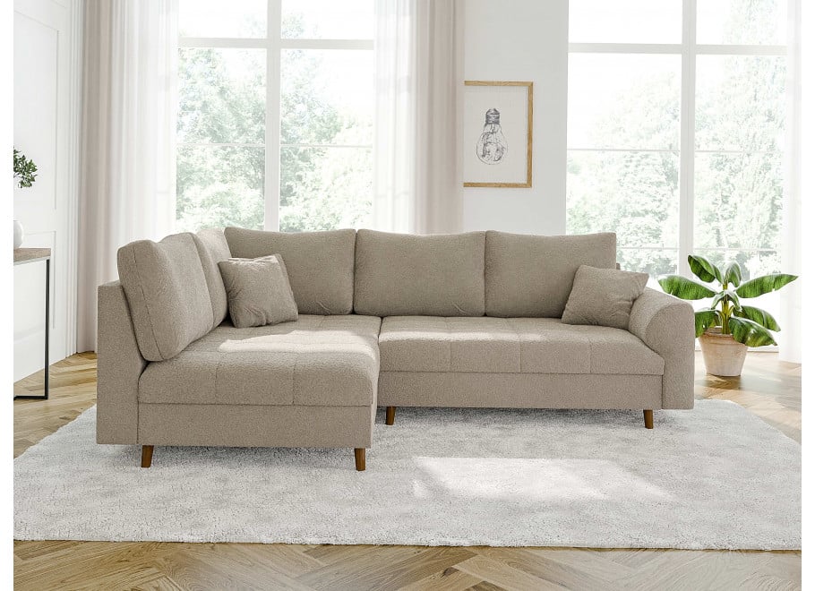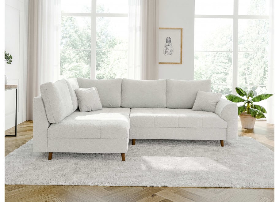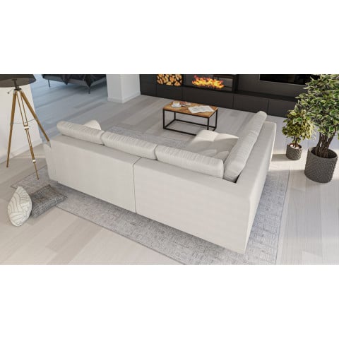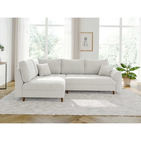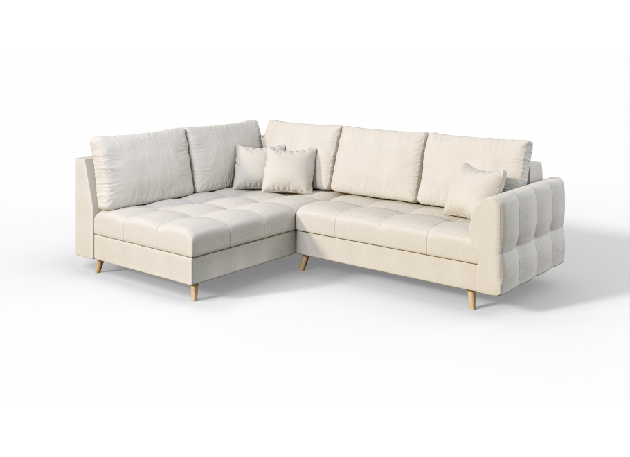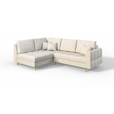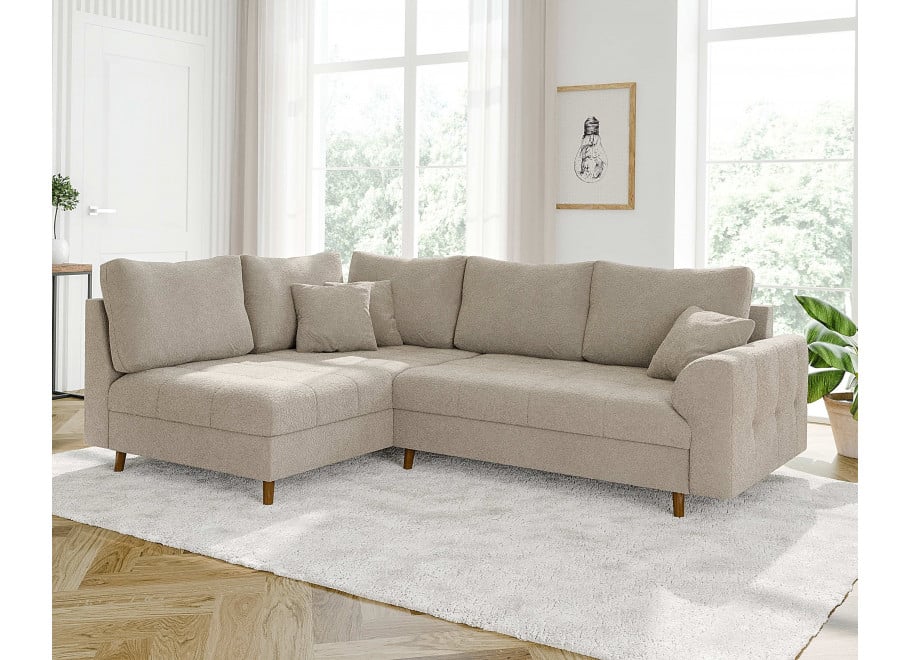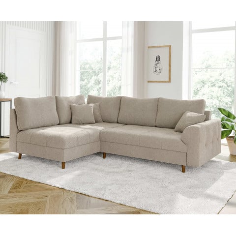 Konstrukcja narożnika opiera się na solidnym fundamencie, co gwarantuje jego trwałość przez długie lata intensywnego użytkowania. Szkielet mebla został wykonany z wysokiej jakości materiałów, takich jak drewno lite, sklejka oraz wytrzymałe płyty wiórowe, MDF i HDF. Takie połączenie surowców zapewnia konstrukcji stabilność i odporność na odkształcenia. Uwagę przyciąga również dopracowana strona estetyczna – pikowane siedzisko nadaje bryle luksusowego sznytu, a osadzenie mebla na eleganckich, drewnianych nóżkach dodaje mu wizualnej lekkości i ułatwia codzienne sprzątanie pod powierzchnią kanapy.