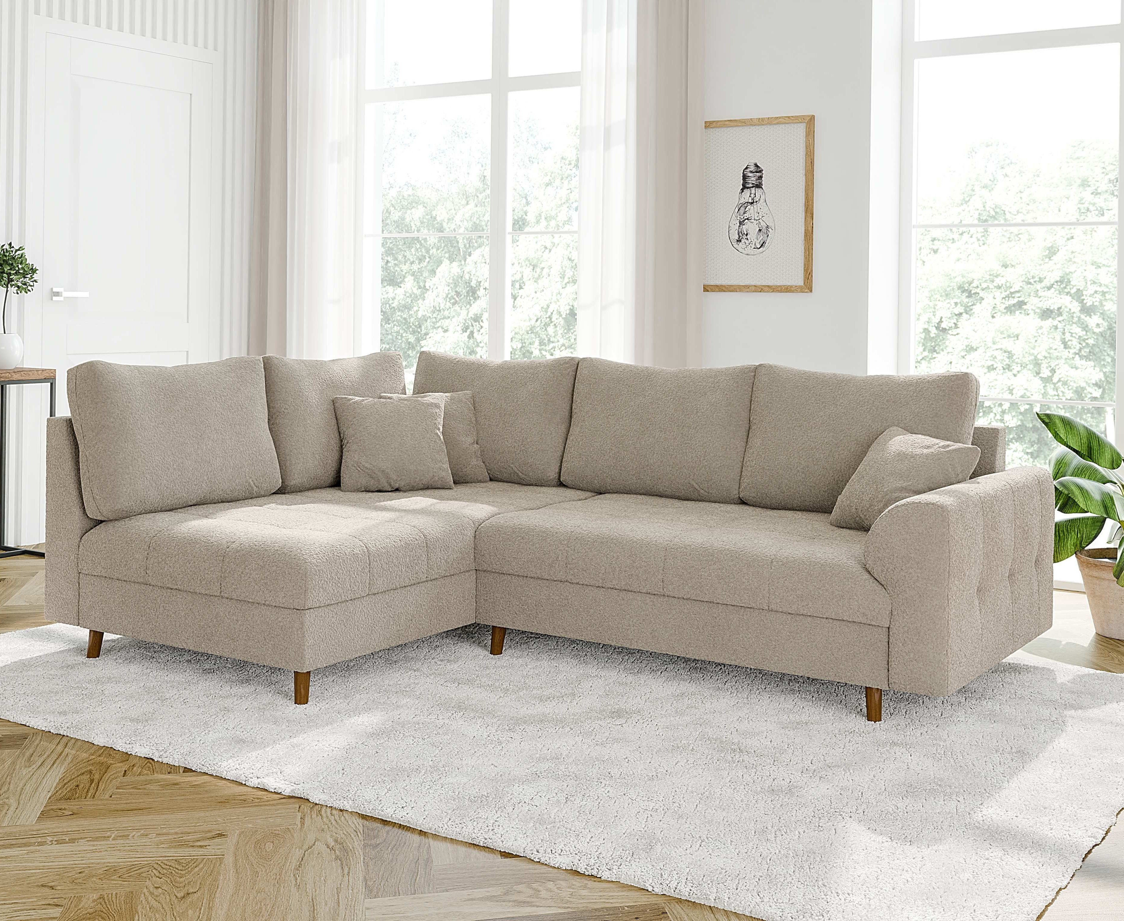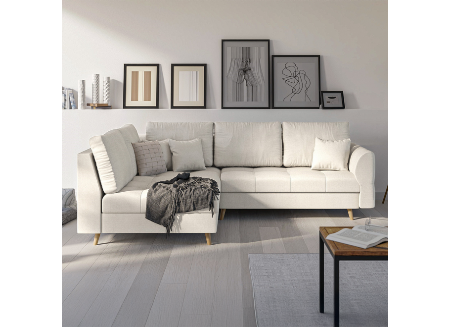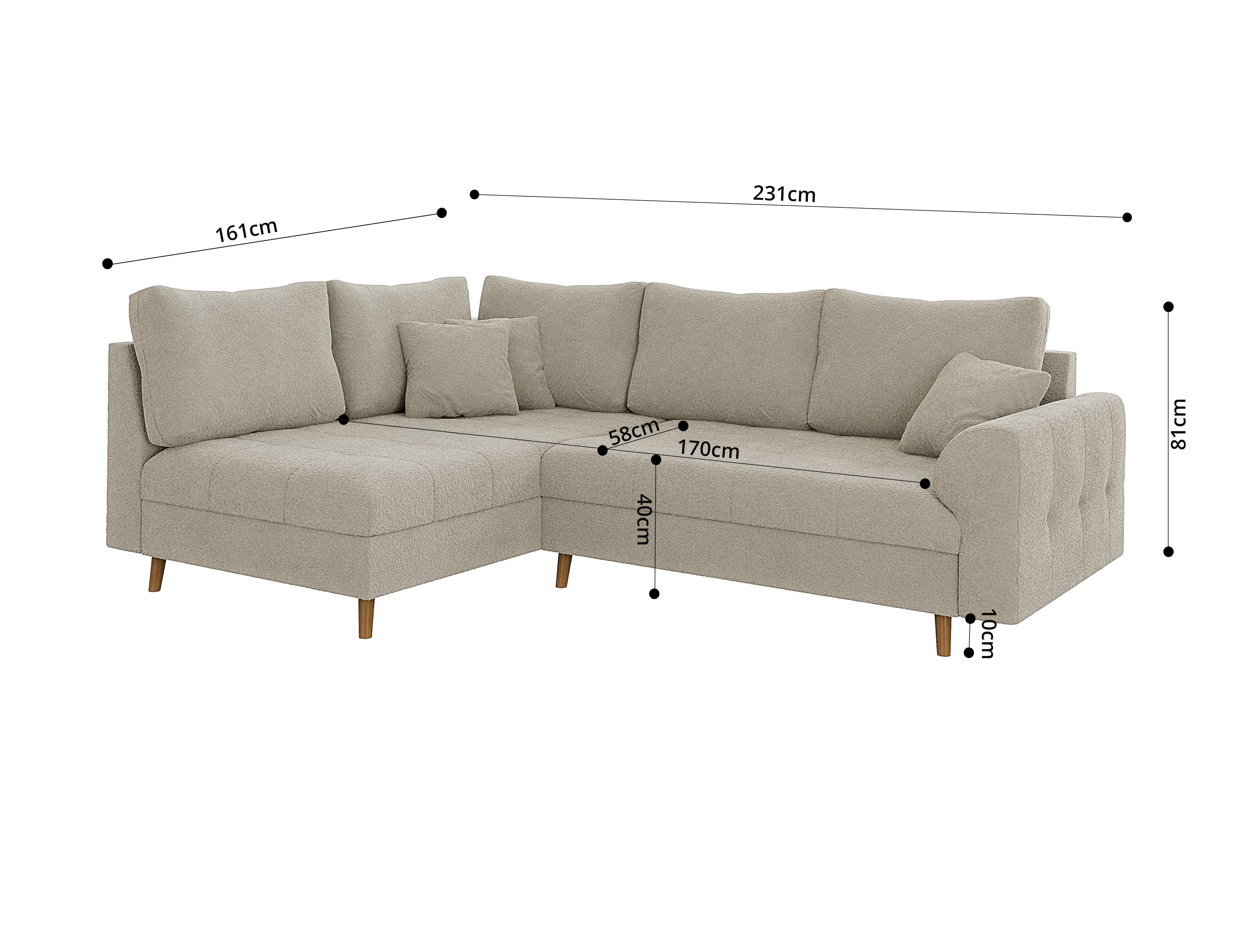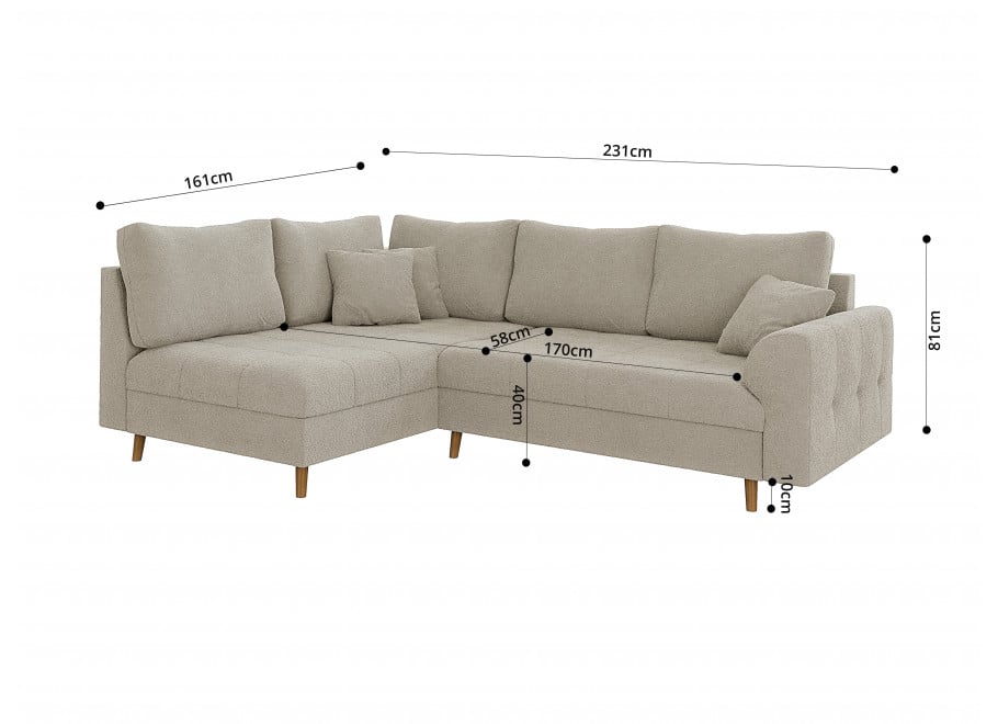 Konstrukcja narożnika opiera się na solidnym fundamencie, co gwarantuje jego trwałość przez długie lata intensywnego użytkowania. Szkielet mebla został wykonany z wysokiej jakości materiałów, takich jak drewno lite, sklejka oraz wytrzymałe płyty wiórowe, MDF i HDF. Takie połączenie surowców zapewnia konstrukcji stabilność i odporność na odkształcenia. Uwagę przyciąga również dopracowana strona estetyczna – pikowane siedzisko nadaje bryle luksusowego sznytu, a osadzenie mebla na eleganckich, drewnianych nóżkach dodaje mu wizualnej lekkości i ułatwia codzienne sprzątanie pod powierzchnią kanapy.
