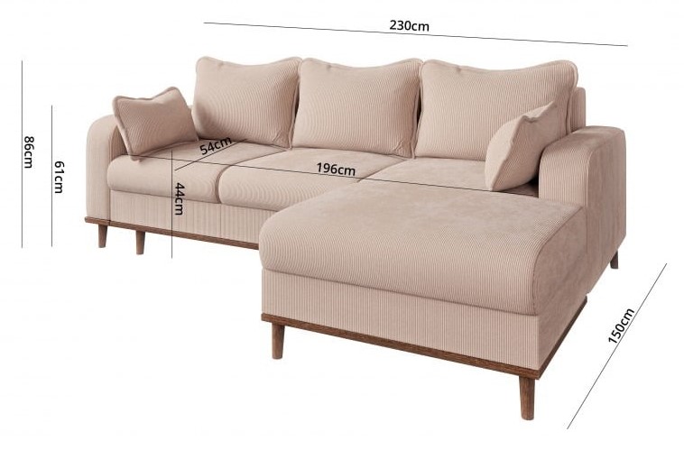 Narożnik Sofi został wykonany z wysokiej jakości materiałów, które są odporne na zużycie i łatwe w utrzymaniu czystości. To mebel, który posłuży Ci przez wiele lat, zachowując swoje pierwotne walory. Smukłe, drewniane nóżki dodają mu lekkości oraz subtelnego, skandynawskiego stylu, który wkomponował się w całość. Dodatkowe poduszki dekoracyjne podnoszą komfort użytkowania oraz dodają sofie przytulności.