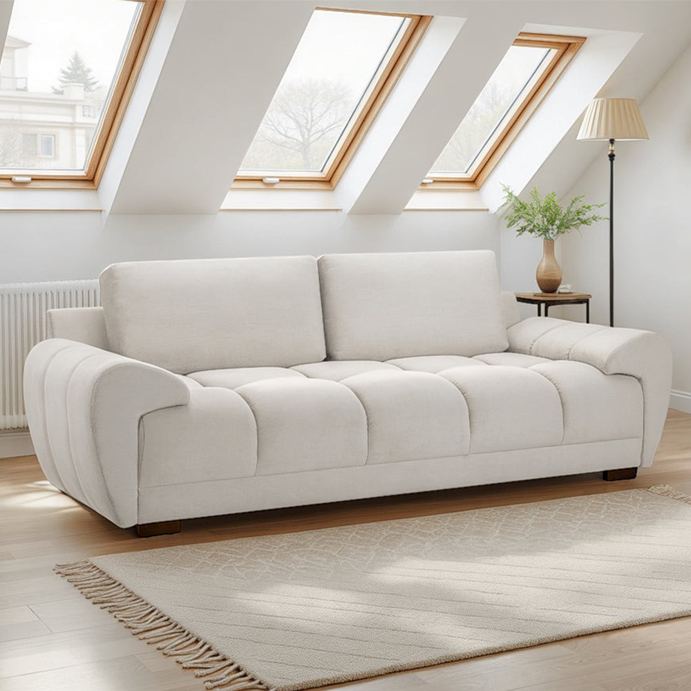 Ta elegancka, trzyosobowa sofa prezentuje nowoczesny design, który wprowadzi do Twojego wnętrza stylowy akcent. Jej zaokrąglone kształty nadają jej przytulny i komfortowy wygląd, jednocześnie dodając sofie unikalnego charakteru. Tapicerka w neutralnym, jasnym odcieniu sprawia, że mebel doskonale wpasuje się w różnorodne aranżacje wnętrz, od klasycznych po nowoczesne.